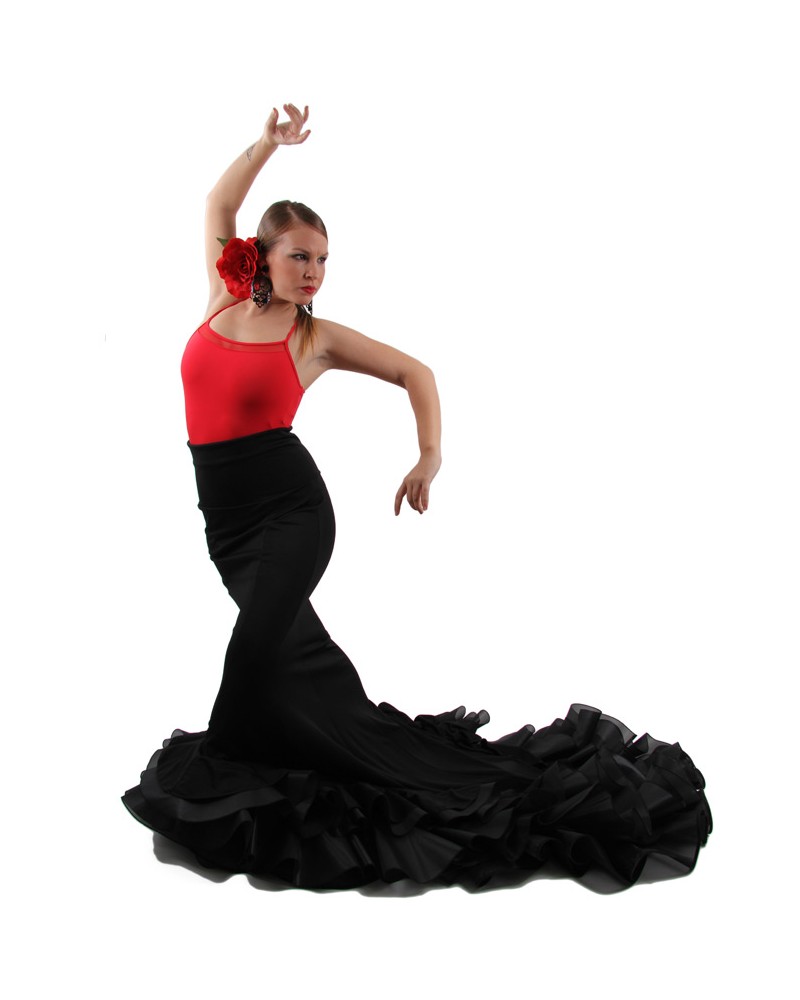 Faldas de cola Flamencas o batas de cola para bailar flamenco tienen una cola de 1 metro, este modelo viene con la cintura alta, su original cintura alta estiliza la figura, la novedad de la cintura alta es que puedes doblarla y usar la falda también como si fuera cintura normal, este detalle hace que esta falda aparte de tener un diseño diferente es un modelo muy actual y estilizada para el baile. Vienen tejidas en punto de seda extra y organza, materiales que le aportan ligereza y garantiza un cómodo y fácil movimiento, esta recomendada para principiantes de flamenco. Esta bata de cola tiene dos volantes, y se confeccionan en los colores negro o rojo, Para otras combinaciones hay incremento de 30 euros